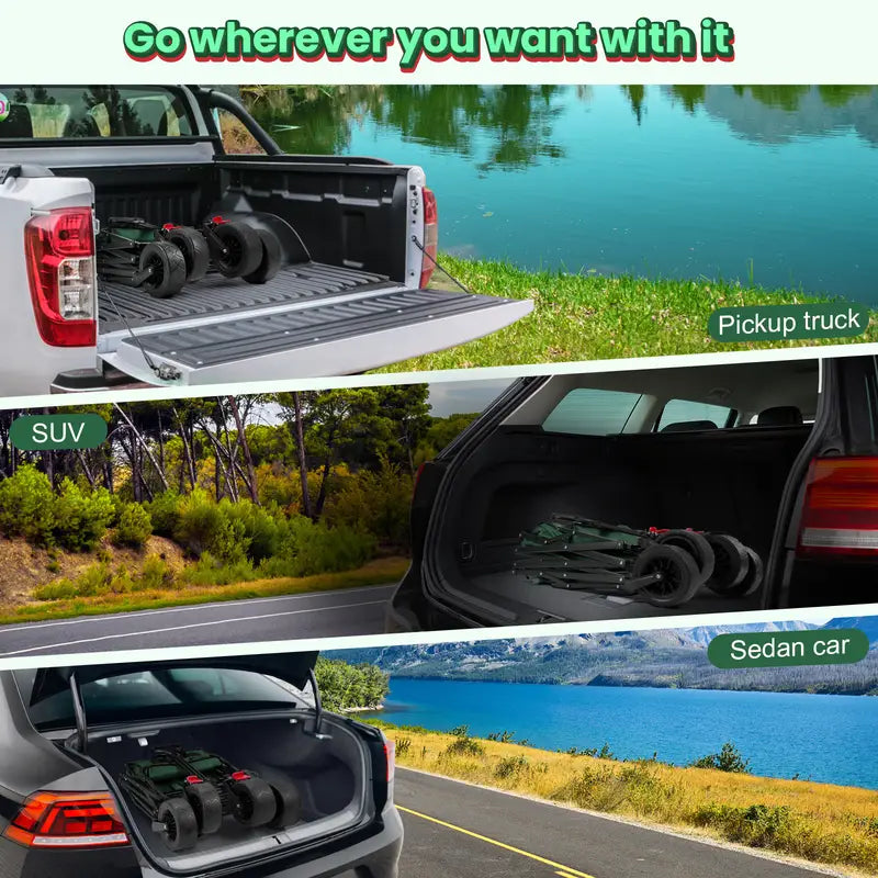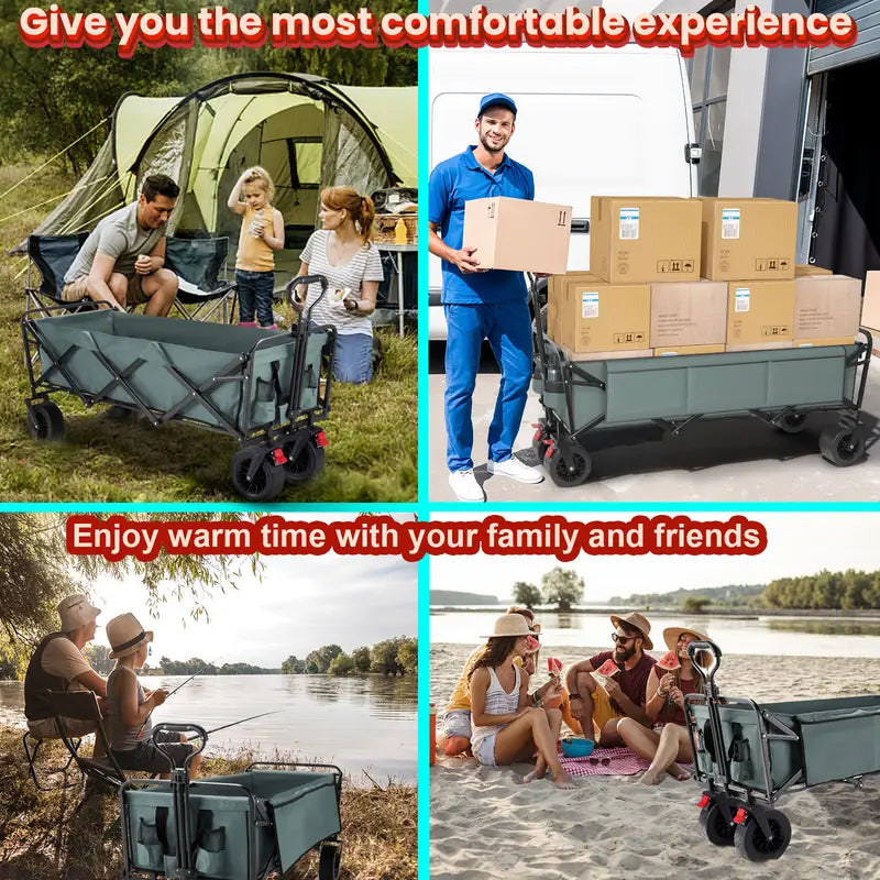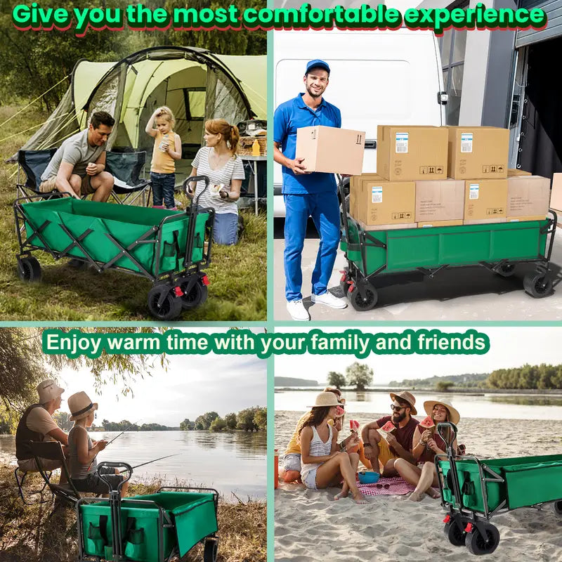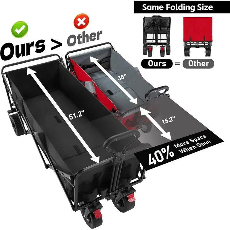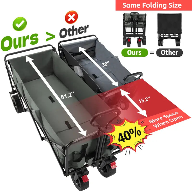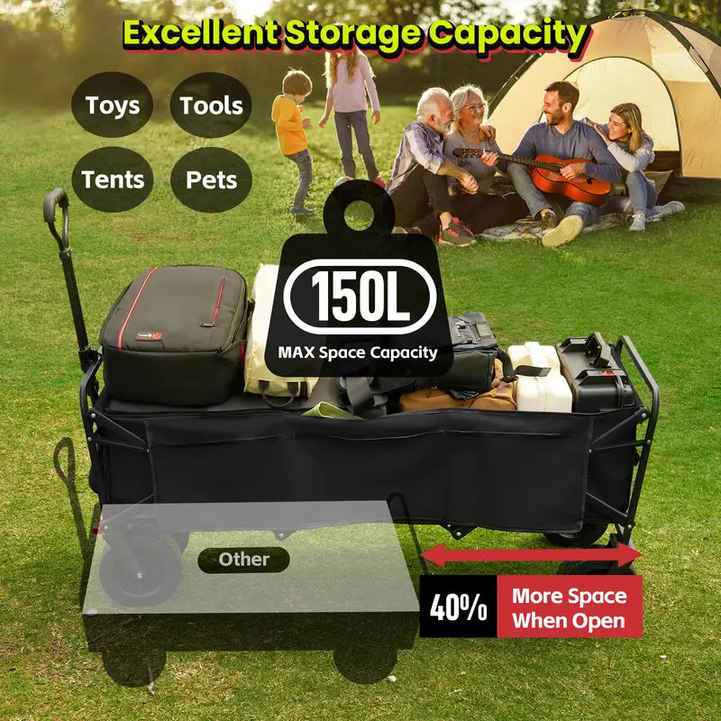 Built with heavy duty high strength metal frame and durable 600D Oxford cloth, this wagon can hold up to 330 pounds, durable and waterproof, not only can easily deal with the plague of a lot of luggage when you go out for a trip, but also suitable for sporting events, carry ons, beach vacations, gardening work, parks, camping, fishing, shopping and so on, almost all of your needs can be met. Extra Space, Extra Load-bearing - Your Good Life Helper! With a length of 51.2 inches and a width of 21.5 inches, this garden stroller can hold up to 150 liters of items and a maximum weight capacity of 330 pounds, making it the perfect first choice for loading groceries or going to the campsite or grocery store for shopping, with at least 30% more space than a regular stroller. With our durable foldable stroller, it's perfect to free your hands and stop worrying about carrying things! Improve the quality of life! Enjoy a happy life! Extended body over 51 inches The extended stroller can be used to transport a 10*10 feet tent without any stress, so you don't have to worry about it being too long anymore. Remove the cart bag and use it to carry flower pots, lumber, delivery boxes and more with ease. All Terrain Extra Wide Thick Fat Wheels The wagon is equipped with four extra thick and wide all-terrain wheels, two of them with brakes, which can swivel 360 degrees and are easy to control and roll without harsh sound and noise. This all-terrain stroller can be driven on a variety of surfaces, including sandy beaches and gravel roads; it's easy to travel in whichever direction you want to go. The Fat Wheel Stroller makes your life easier, allowing you to avoid back problems and physical strain. Compact, foldable design It's so cool that this stroller can be folded up in seconds. The interior of the stroller is designed with a drawstring and requires no installation. You can quickly fold it to mini size by just using your hands without taking up too much space