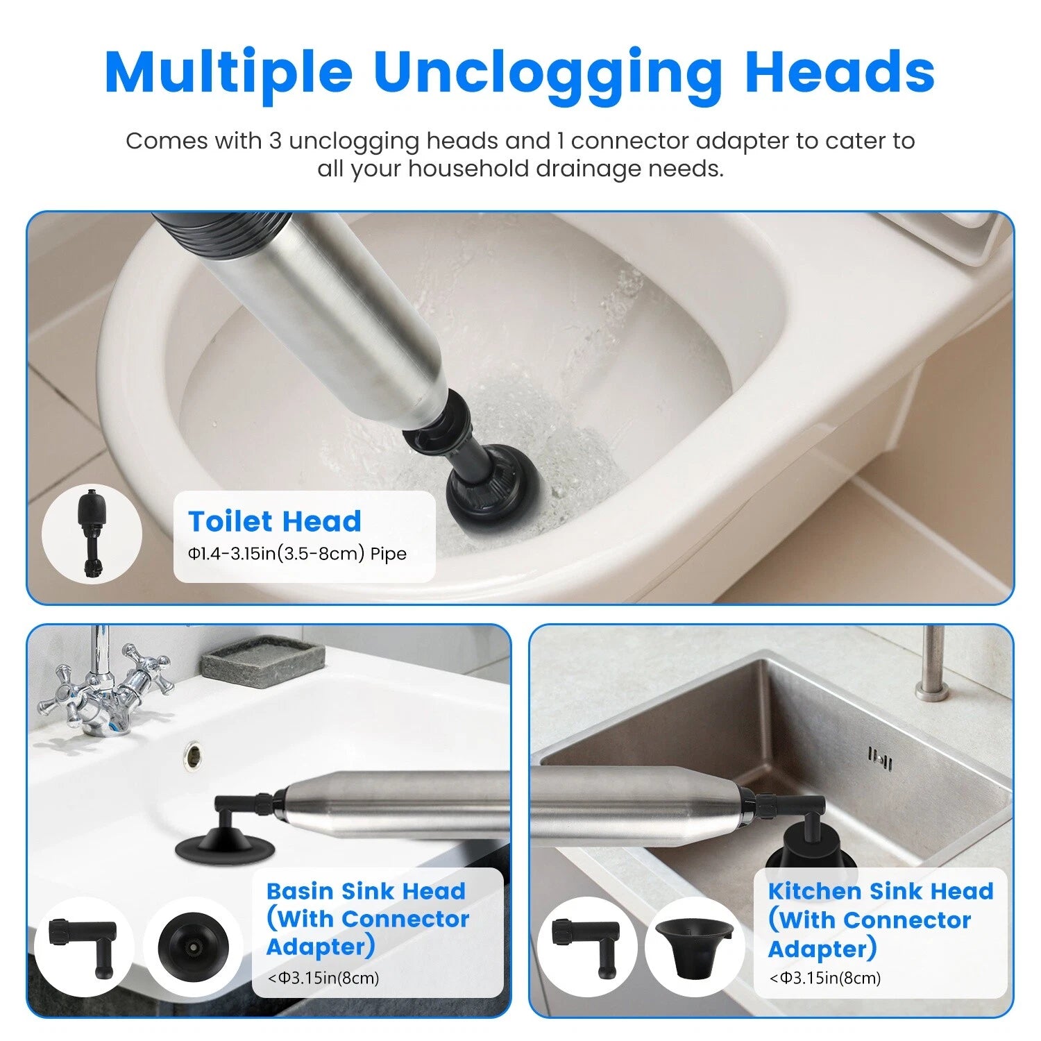 - [One-Stop Solution] Unlike traditional toilet unclogger that can only be used for unclogging toilets, AMPFORCE's electric heavy duty blaster comes with multiple plunger heads, which means it can also be used for unclogging sinks, showers, kitchen drains, and pipelines.